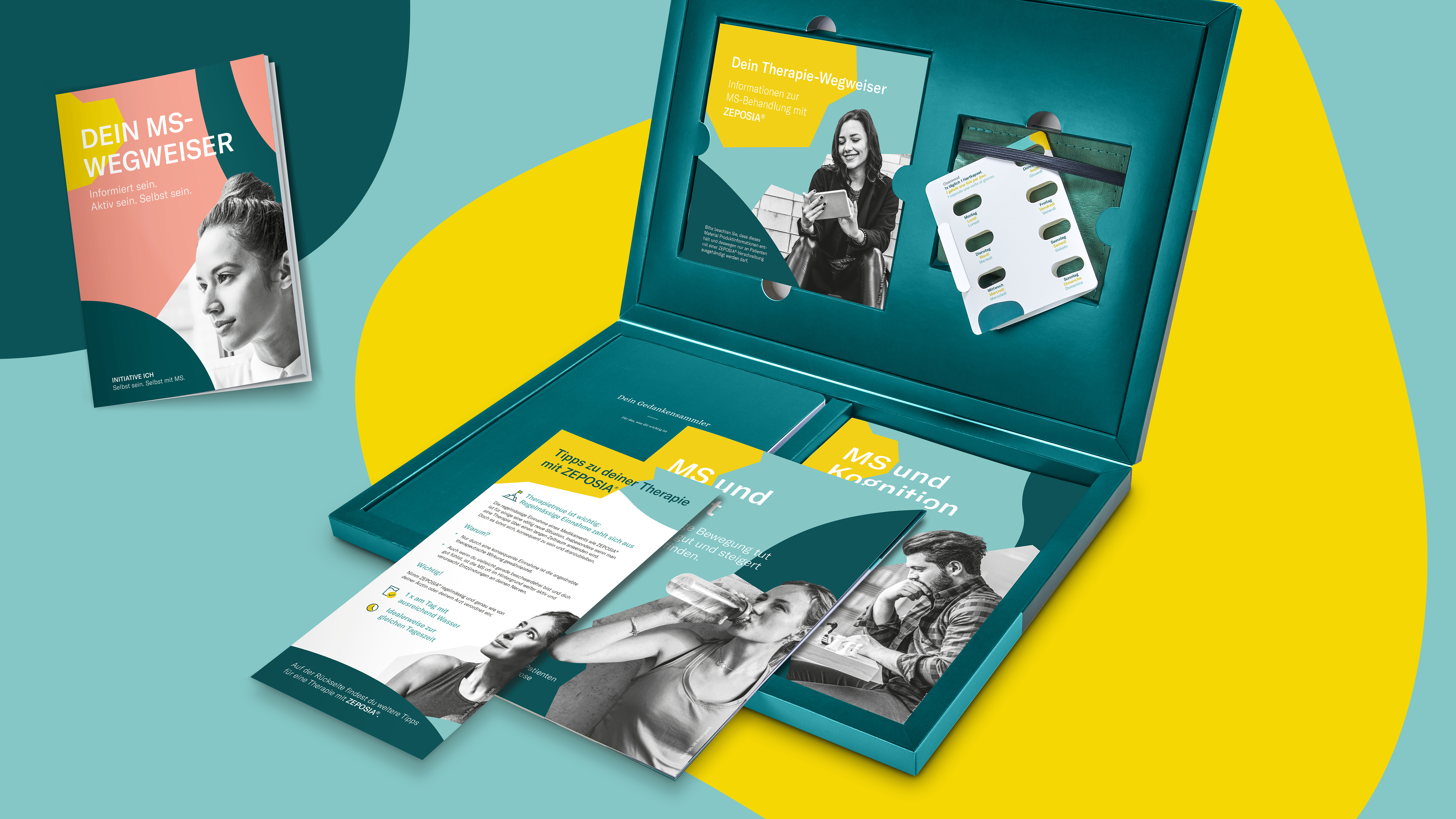 Patientenbroschüre (unbranded) und Therapiestart-Box mit den wichtigsten Informationen zur Therapie mit Zeposia.